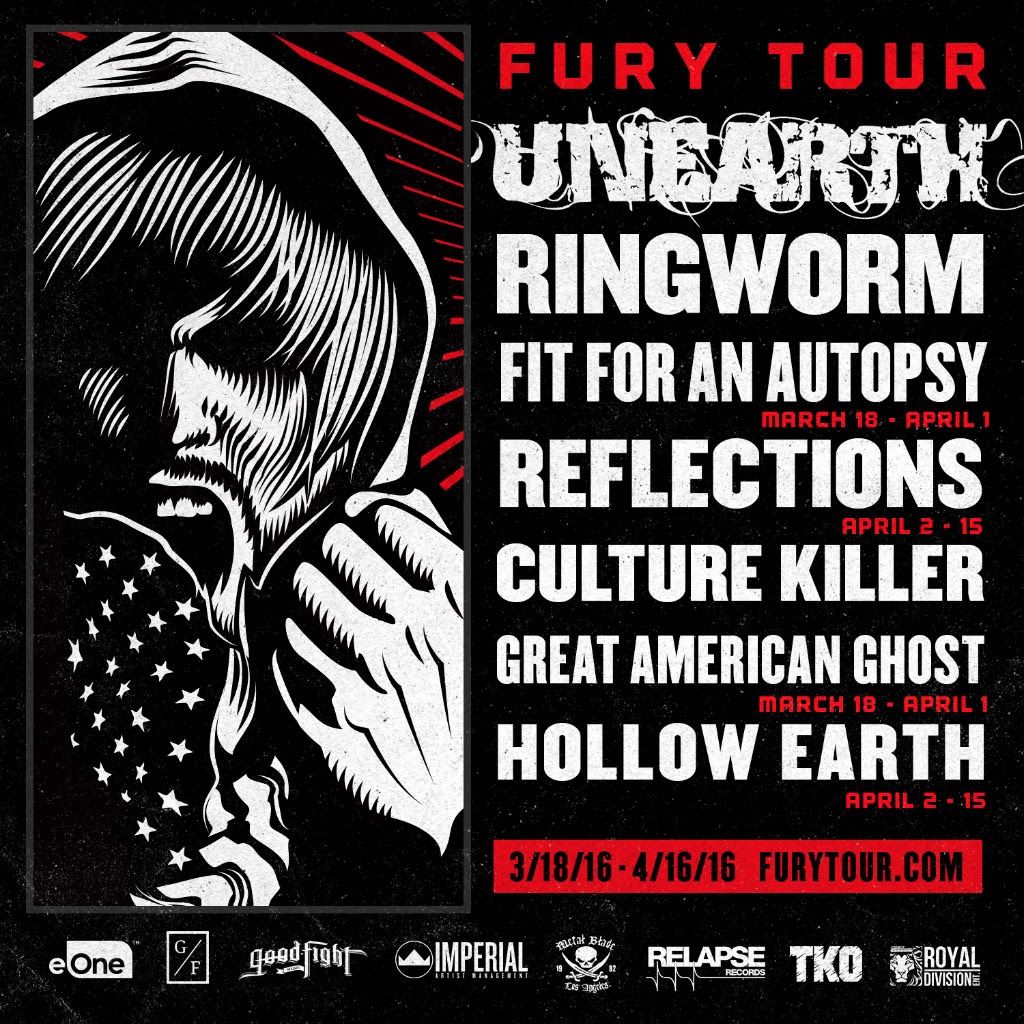 The metal band, Unearth, has announced a North American tour, called the “Fury Tour,” for March and April. Ringworm and Culture Killer will be support on all dates, while Fit For An Autopsy and Great American Ghost will be on the first half and Reflections and Hollow Earth will be on the second half. You can check out the dates, details and poster, after the break.