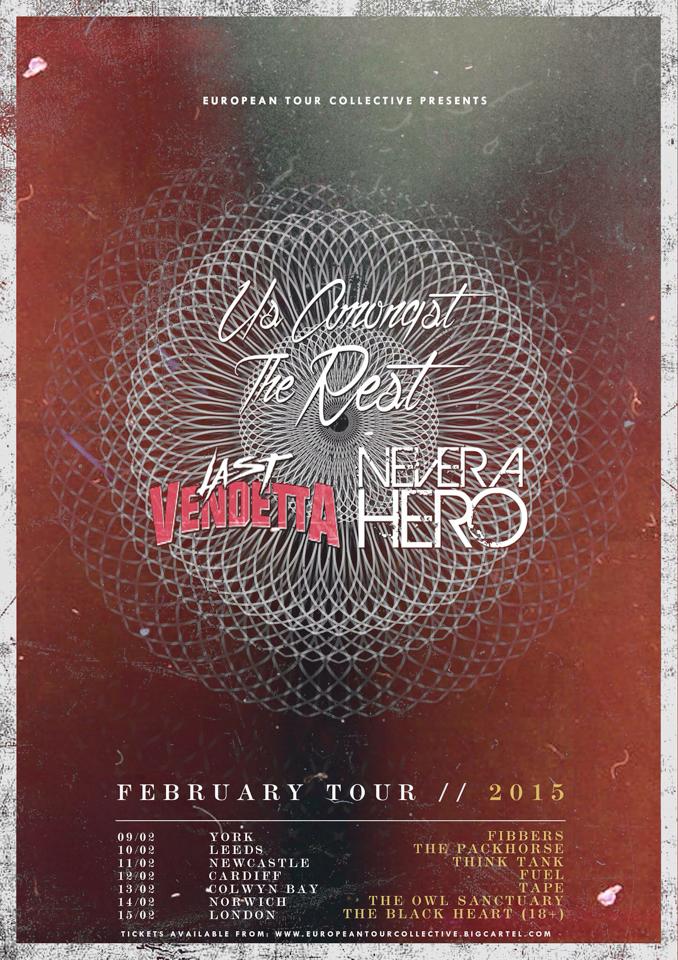 The hard rock band, Us Amongst The Rest, has announced a short UK tour for February. Never A Hero and Last Vendetta will be joining the tour, as well. You can check out the dates, details and poster, after the break.