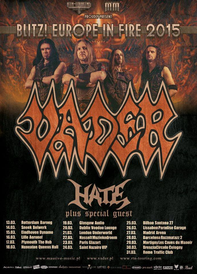 The death metal band, Vader, has announced their upcoming European tour, called the “Blitz! Europe In Fire 2015 Tour.” They will be touring in support of their latest album, Tibi Et Igni . Hate, plus a special guest that is to be announced, will be joining as support. You can check out dates, details, and poster, after the break.