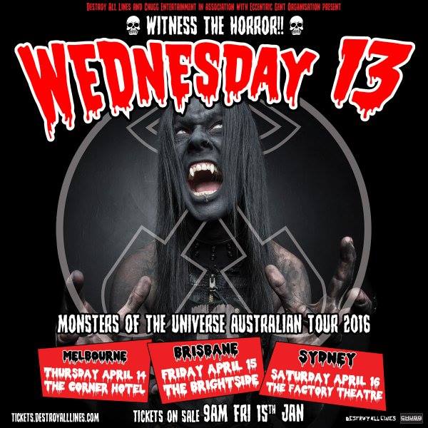 The horror punk artist, Wednesday 13, has announced a brief Australian tour, called the “Monsters of the Universe Australian Tour 2016,” for April. You can check out the dates, details and poster, after the break.