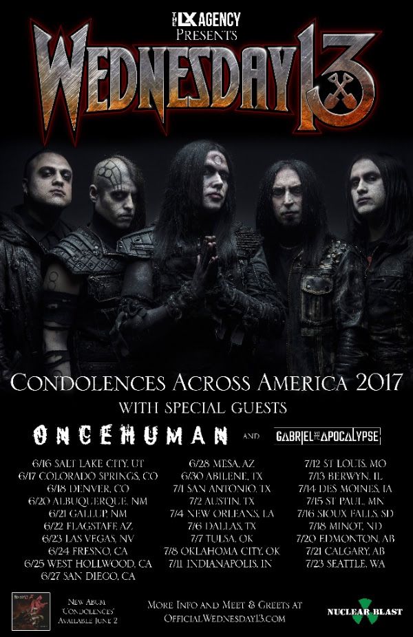 The metal band, Wednesday 13, has announced a summer U.S. tour, called the “Condolences Across America 2017,” for June and July. This tour is in support of their upcoming album, Condolences. Once Human and Gabreil and the Apocalypse will join the tour, as support. You can check out the dates, details and poster, after the break.