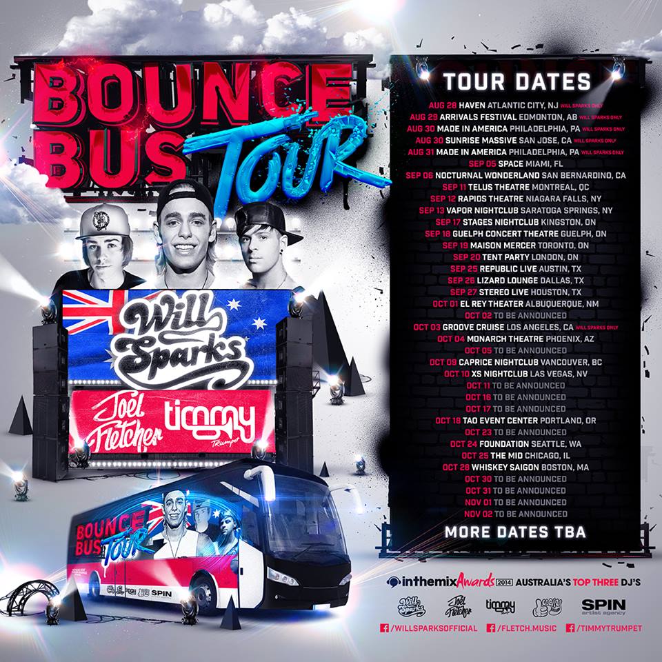 The electronic artist, Will Sparks, has announced a co-headlining tour with Timmy Trumpet and Joel Fletcher, called the “Bounce Bus Tour.” The tour will be hitting cities across North America, in the fall. You can check out the dates, details and poster, after the break.
