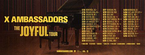 The alternative rock band, X Ambassadors, has announced a headlining U.S. tour, called “The Joyful Tour”, for February through May. Misterwives, Son Little, Mondo Cozmo, The Aces, Jacob Banks, SHAED, Fletcher, morgxn, and Now, Now, will join as support on various dates.