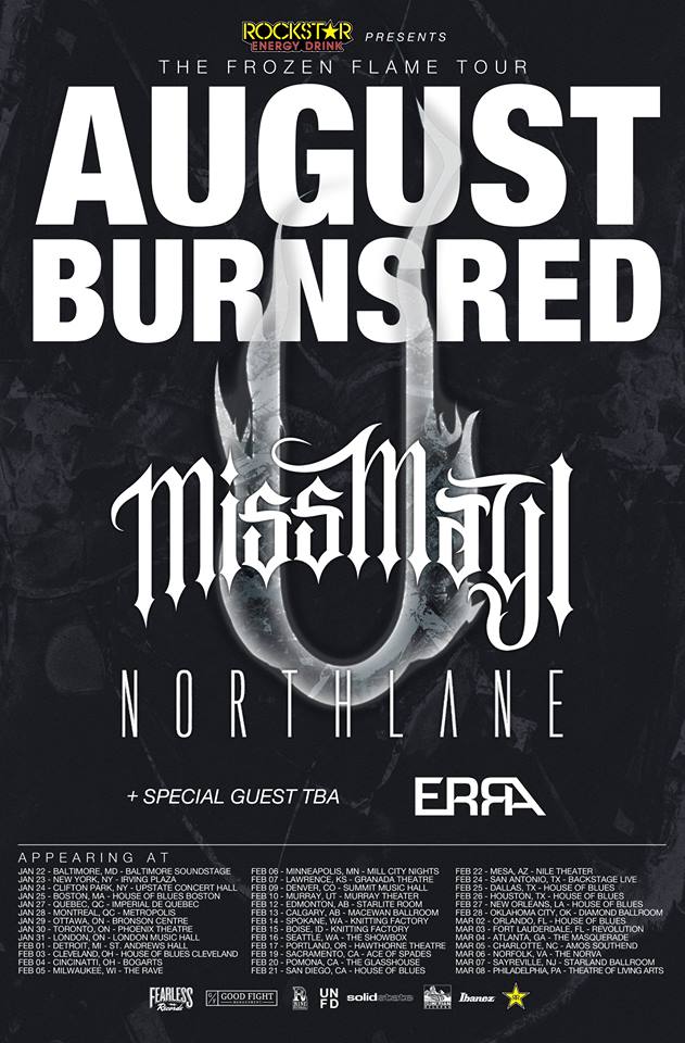 August Burns Red August Burns Red Announce “The Frozen Flame Tour” The hardcore band, August Burns Red, has announced a North American tour, called “The Frozen Flame Tour,” for winter 2015. Miss May I, Northlane and Erra will be joining as the supporting acts. You can check out the dates, details…
